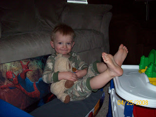 Well Ethan is now 1 1/2 years old and I am quite glad to say that we haven't had any trips to the emergency room. With the amount of bruises and bonks on the head that Ethan gets on a daily basis, it is actually a miracle that we haven't visited the ER. Just yesterday, Ethan was playing around the fireplace. He wasn't actually up on it this time like he normally is, but he thought it would be smart to stand on his toy vacuum next to the rock and the vacuum slid out from underneath him and down he went. Resulting in his first cut to the head. It didn't really bleed but it looks cool. Don't freak out grandma & nana. :)Before the accident watching "The Backyardigans"